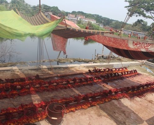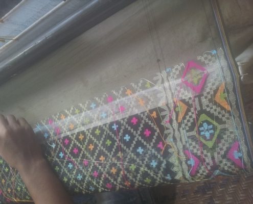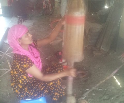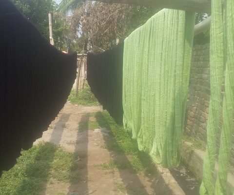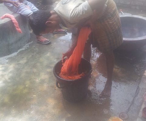 Aber bei 19 Volksschulen, und 2 High-schools, sind das viele Schüler. Auch haben wir etliche Stofftaschen und Sportrucksäcke genäht. In Dhaka habe ich auch die Lehrerin von Alikadom unterrichtet, weil ich wegen der schlechten politischen Lage hier im Land, nicht für längere Zeit nach Alikadom gehen konnte. Jetzt im April, war ich in der Ortschaft Rupgonj Jamdani Polli. Dieses Dorf ist nicht sehr weit von Dhaka entfernt. Dort werden Saris gewebt und gebatikte Stoffe hergestellt.